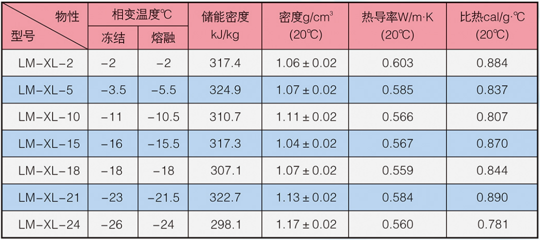 LM-XL系列產(chǎn)品由主儲能劑、相變調(diào)整劑、防過冷劑、防相分離劑、誘發(fā)劑等多組分復合制備而成。本品通過液-固-液相態(tài)變化實現(xiàn)冷能的儲存和釋放,具有較高的儲能密度及合適的比熱和導熱系數(shù)。本品不易揮發(fā)、安全可靠,可以反復使用。